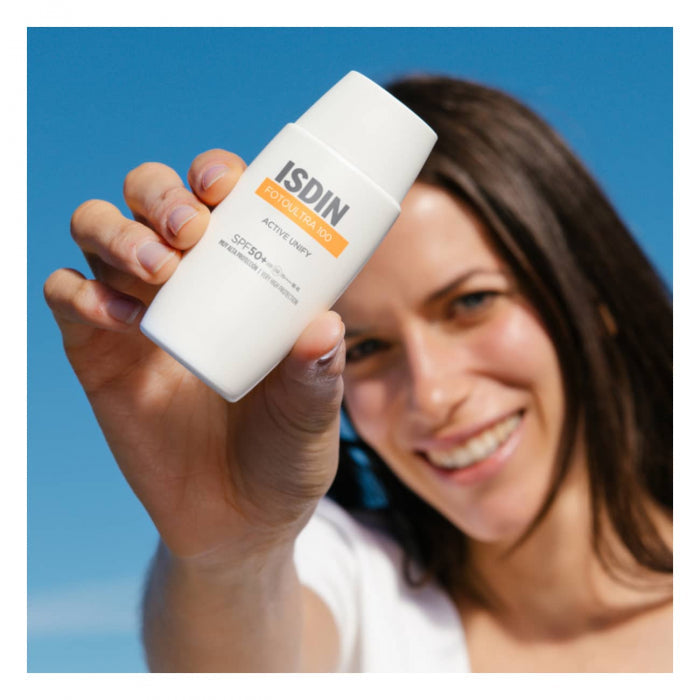 ISDIN FotoUltra 100 Active Unify confere um ecrã total anti-UV, 2 vezes superior ao exigido nos protetores com SPF50+, para proteger a pele de forma mais eficiente.